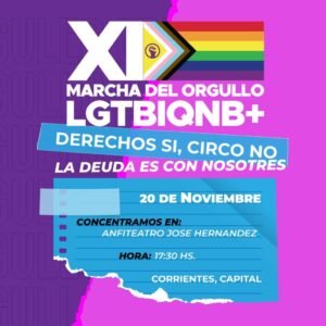 Desde la Fuerza Transfeminista Correntina sostuvieron “la importancia de la XI Marcha del orgullo LGTBIQNB+ en el marco de las históricas marchas en varias localidades de la provincia como ser Caa Catí, Paso de los Libres, Curuzú Cuatia, Goya, Santo Tome, y llamaron a la ciudadanía a “sumarse a una jornada histórica por los derechos de la diversidad sexual y de géneros a lo largo y ancho de la provincia, es importante que les correntines jerarquicen nuestra agenda política, nuestras voces, historias y demandas que venimos visibilizando hace 11 años en nuestra provincia”.